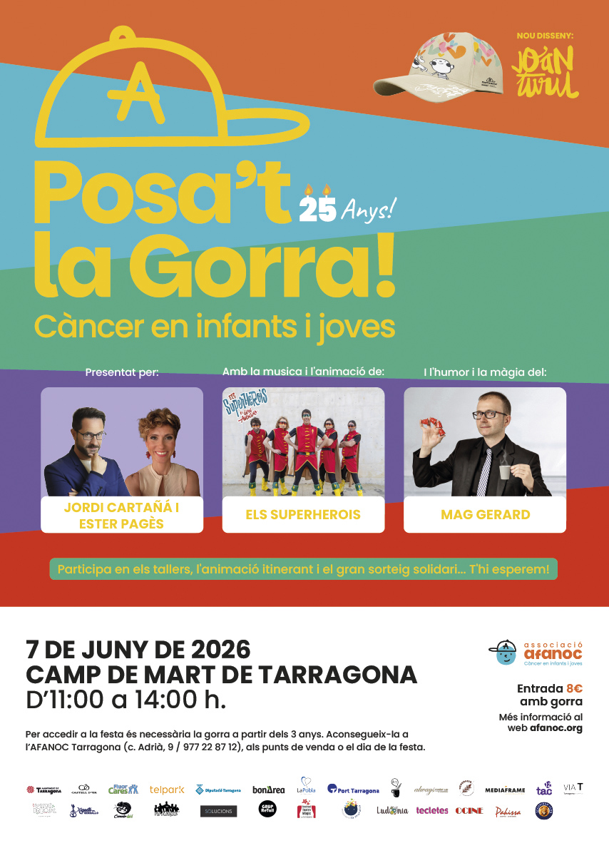 Enguany, la festa compta amb una gorra solidària dissenyada per l’il·lustrador Joan Turu, que simbolitza el valor de l’acompanyament i la complicitat. La gorra es podrà adquirir en tallatge infantil i adult el mateix dia de la festa, a les parades prèvies que organitzarem i als diferents punts de venda habilitats a la ciutat i en diverses poblacions de la província. Per accedir-hi, només cal portar la gorra d’enguany.