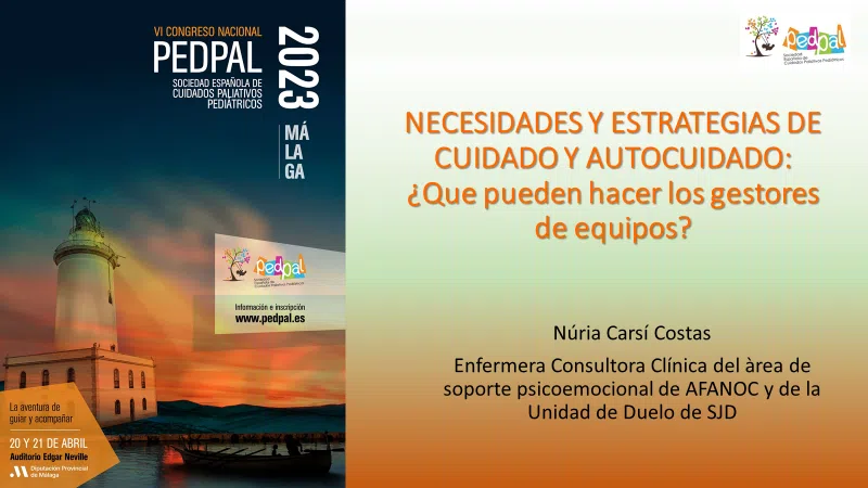 La SOCIEDAD ESPAÑOLA DE CUIDADOS PALIATIVOS PEDIATRICOS, realitza aquest congrés a Màlaga el 20 i 21 d’Abril amb el lema “L’aventura de guiar i acompanyar”, una oportunitat de compartir experiències, coneixements i vivències amb equips de cures pal·liatives pediàtriques de tot l’estat, familiars i associacions. La Núria Carsí Costas, infermera i consultora clínica de l’Àrea de Suport Emocional de l’AFANOC i de la Unitat de dol de Sant Joan de Déu, estarà present com a ponent en una de les taules rodones on desenvoluparà la temàtica: